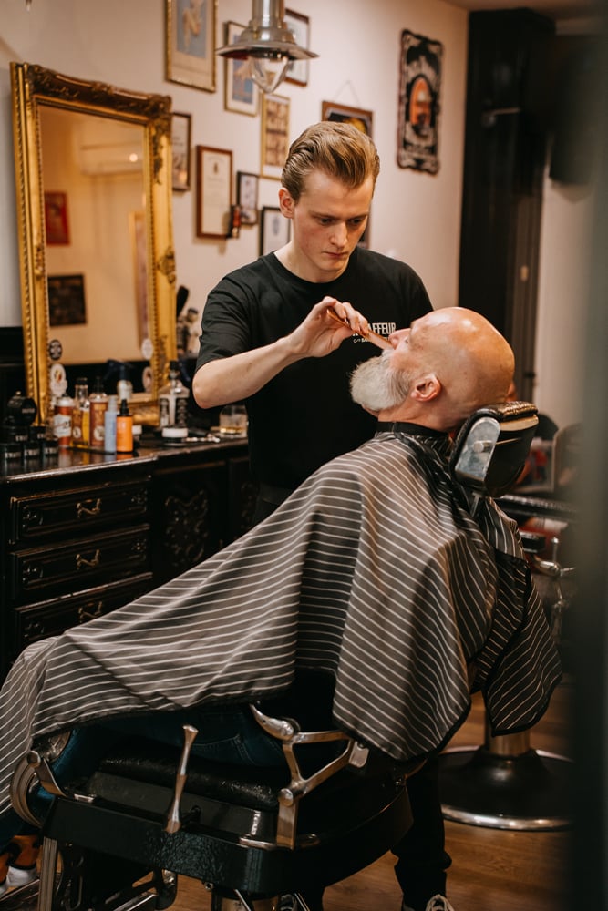 Scheren volgens de regels van de kunst: met warme handdoeken, goede scheerzeep, een scheerbeurt met open scheermes en de perfecte verzorging achteraf.